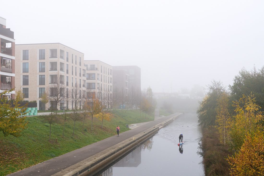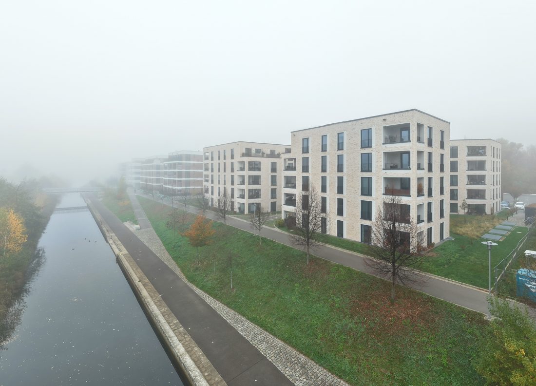 Für RKW Architektur + habe ich am Lindenauer Hafen in Leipzig fotografiert. Es war für mich interessant, die Gebäude in unterschiedlichen Jahreszeiten zu fotografieren. Architekturfotografie im Nebel – kann man ja mal ausprobieren!